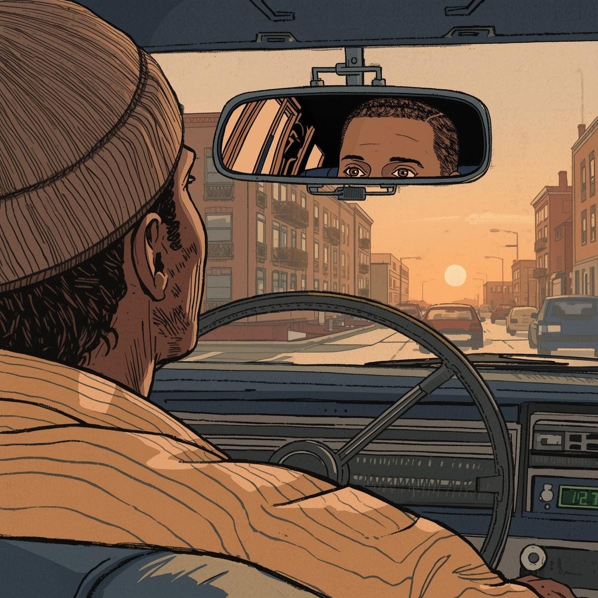 They rode in silence for a few blocks. The hum of tires blended with a low soul melody the driver hummed Sly Stone under his breath. Then Corey realized the streets weren’t familiar. The towers had thinned into aging storefronts and cracked sidewalks. Streetlights flickered. The city had shifted from tech polish to memory—like they’d slipped through a fold in time.